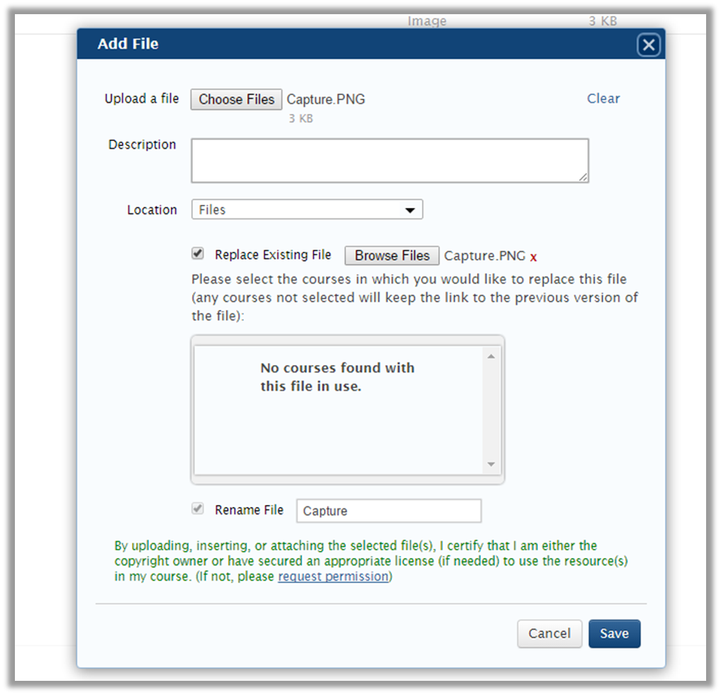 If a file with the same file name already exists, selecting Replace Existing File will allow the option to select which file to replace from the files already uploaded to Learning Suite.