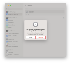 - Step 3: Delete eduroam profile. Please confirm the deletion of the profile by clicking "Remove".