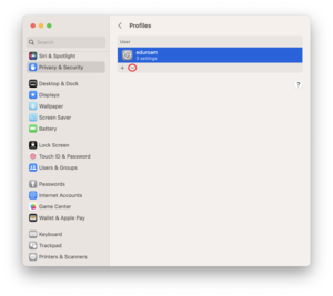- On the left side, select "Privacy & Security" and select "eduroam" on the right side under "Profiles". You can now delete the profile by clicking the minus button.