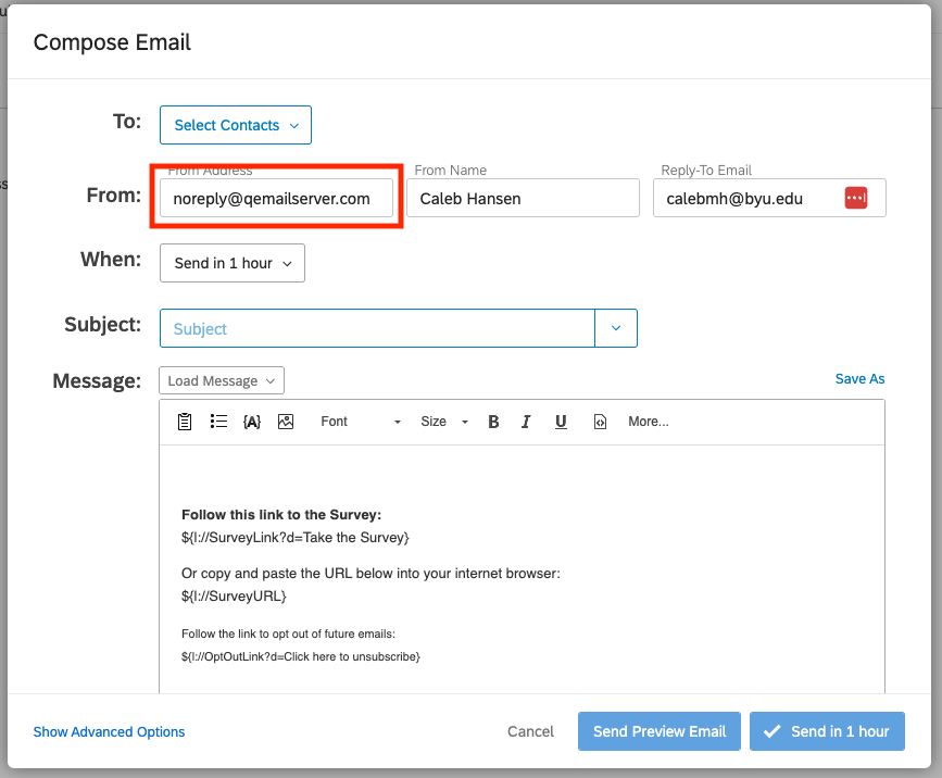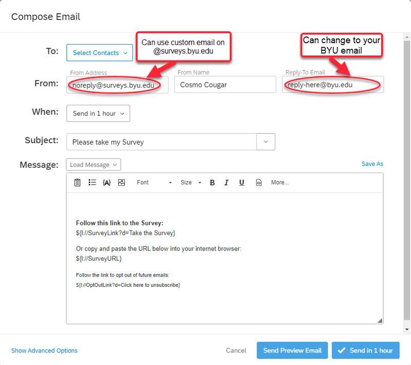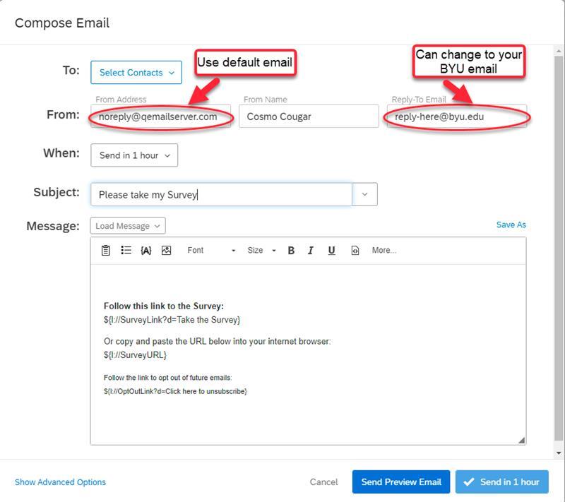 If you are currently using custom addresses in your surveys rather than the default [noreply@qemailserver.com], you will want to note the required change. For example, if my surveys are coming from testing@byu.edu, then after February 1, I will want to change the "From" address to testing@surveys.byu.edu. This allows email providers to recognize the survey emails as having been sent from BYU and not flag them as spam. The reply-to address can remain customized and will not present deliverability problems. In the case of our example above, if I have a custom reply-to address testing@byu.edu I will not have to change that. There are screenshots at the end of this email if you would like more specifics about customizing.