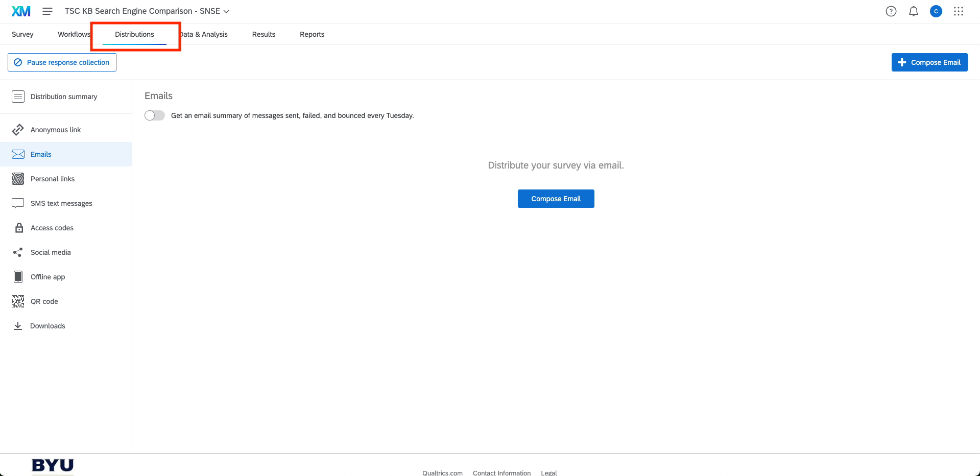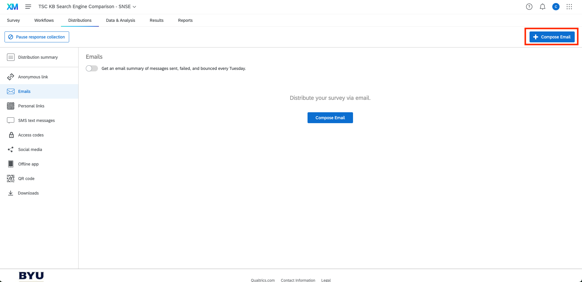 Some users distribute their surveys to the desired group or individual(s) through the email feature found in “Distributions.” Here they can compose an email with the survey link to the desired contact list.