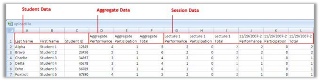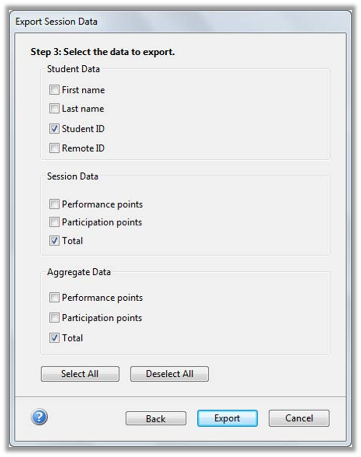 - The Export Session Data, step 3 screen appears. Select the Student Data, Session Data (data for each individual session), and Aggregate Data (the combined performance points, participation points, and total point for all the selected sessions) to be exported.