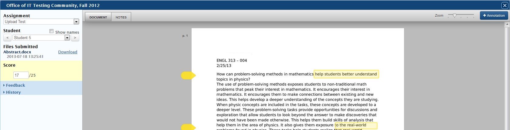 - Click on the paper icon next to an uploaded assignment. This will open the grader for that particular student's assignment.